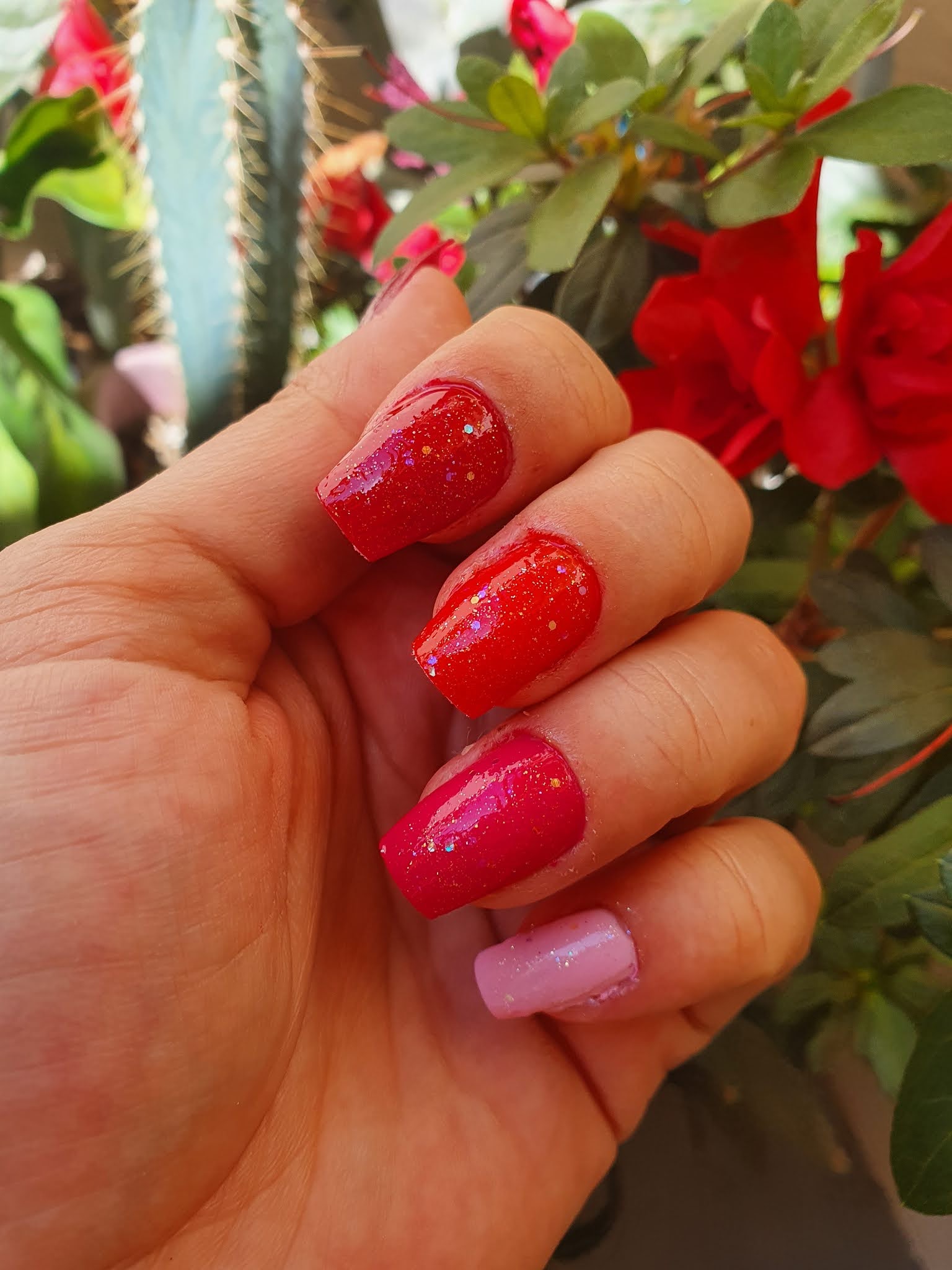 Vamos lá, antes de contar sobre a esmaltação: como estávamos comemorando um ano de desafio, a ideia foi sortear entre todas as participantes os temas que já tínhamos feito e eu caí novamente no amor e fiquei feliz, já que não tinha curtido tanto minha esmaltação passada haha, enfim agora a escolha das cores. Pra representar o amor eu resolvi fazer uma unha de cada cor, usando uma paleta de cores vermelha e rosa, no fim das contas na foto ficou parecendo que era tudo igual e só a rosinha claro que estava diferente.
